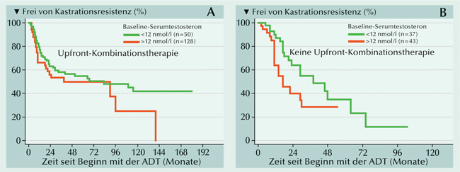 Dagegen war die Zeit bis zum CRPC bei Erhalt einer Upfront-Kombinationstherapie nicht durch den Baseline-Testosteronspiegel beeinflusst (Abb. B).