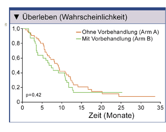 Das mediane progressionsfreie Überleben betrug 9,1 Monate im Arm A und 7,1 Monate im Arm B (Abb.). Die Gesamtansprechraten