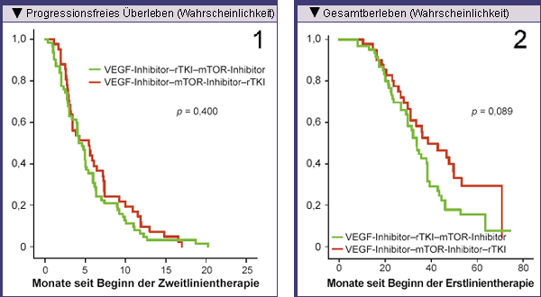 Von insgesamt 103 Patienten hatten 62 nach Versagen der Erstlinientherapie mit einem VEGF-Inhibitor zuerst einen rTKI und danach einen mTOR-Inhibitor und 41 die Sequenz mTOR-Inhibitor–rTKI erhalten. Als erster VEGF-Inhibitor war bei den meisten Patienten Sunitinib eingesetzt worden.