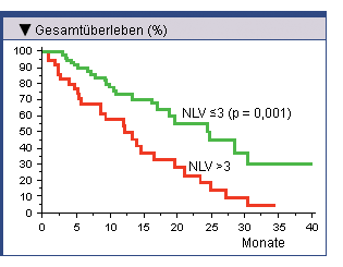 Als medianes NLV wurden 2,2 ermittelt. Anhand ihres NLV wurden die Patienten in eine Gruppe A (NLV >3) und eine Gruppe B (NLV ≤3) eingeteilt. Mit diesem Trennwert wurde der höchste prognostische Wert erreicht. Im gesamten Kollektiv betrug das Gesamtüberleben mit Everolimus 18,6 Monate. In Gruppe A (n = 38) waren es 12,2 Monate und in Gruppe B (n = 59) 24,4 Monate. Für das progressionsfreie Überleben ergaben sich insgesamt 5,3 Monate (Gruppe A: 3,4 Monate und Gruppe B: 9,9 Monate.