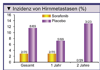 von Hirnmetastasen betrug in der mit Sorafenib behandelten Gruppe 3% (2 von 70 Patienten) gegenüber 12% (8 von 69 Patienten)